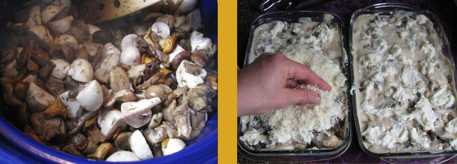 Een hele pan vol gebakken paddenstoelen doet de keuken alvast herfstig naar beregend bos ruiken. Lekker veel kruiden erdoor; dat belooft wat. Dan béchamelsaus maken en de kaas raspen. Het vul- len van de ovenschalen met paddenstoelen, vellen pasta, kaas en saus heeft iets rustgevends, bijna als spelen met lego. Waarbij je ook van losse onderdelen iets moet bouwen; dus dat klopt wel.